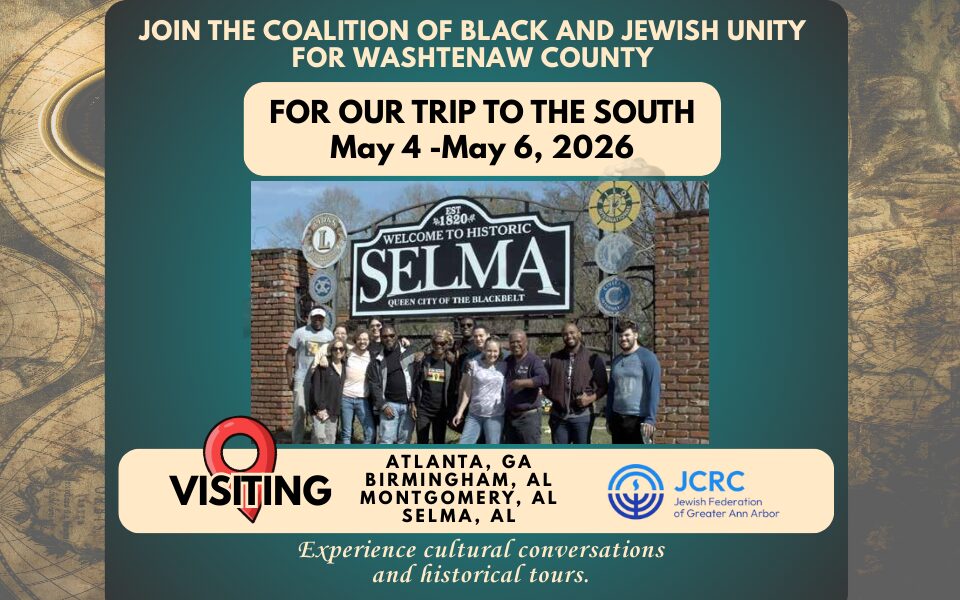 JCRC OF JEWISH FEDERATION OF GREATER ANN ARBOR & WASHTENAW BLACK JEWISH COALITION present a CIVIL RIGHTS JOURNEY - MISSION to the SOUTH Participants are responsible for travel to and from Atlanta. Our journey will begin and end at the Atlanta International Airport. This trip has several sponsors allowing us to provide bussing, meals, and […]