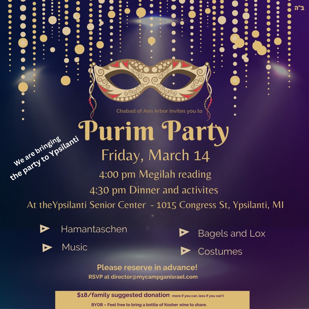 Chabad is bringing the party to Ypsilanti! This is the first public Purim Party in our town. Bring your costumes and joy, let’s celebrate together. See you there! BYOB - feel free to bring a bottle of kosher wine to share $18/family suggested donation - more if you can, less if you can't RSVP in […]