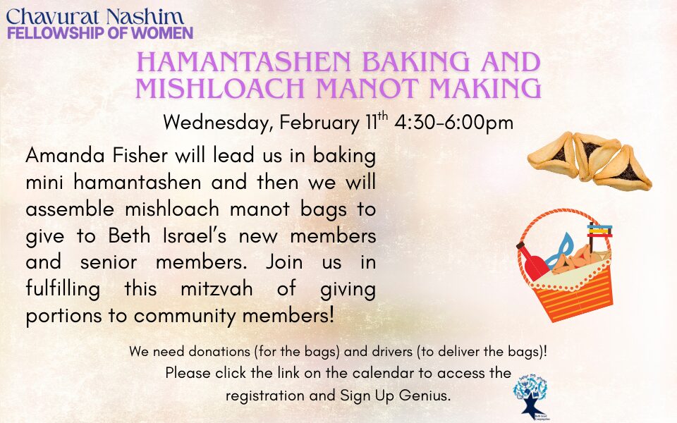 Amanda Fisher will lead us in baking mini hamantashen and then we will assemble mishloach manot bags to give to new members and older members. Join us in fulfilling this mitzvah of giving portions to community members! We need donations(for the bags) and drivers (to deliver the bags). Please register through the calendar and follow […] |