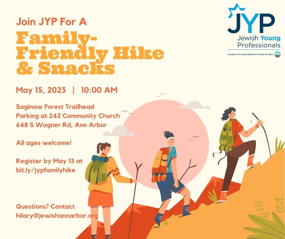 Saginaw Forest Trailhead Parking at 242 Community Church. 648 S Wagner Rd, Ann Arbor All Ages Welcome! Register by May 13 at bit.ly/jypfamilyhike Questions? Contact hilary@jewishannarbor.org