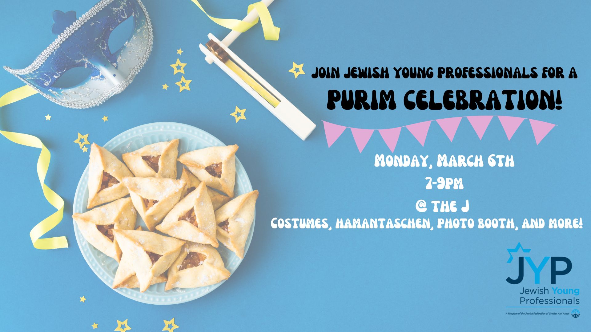 Join JYP for a Purim Celebration! Monday, March 6th 7-9PM @ The J Costumes, Hamantaschen, Photo Booth & More! Register for JYP Purim Celebration