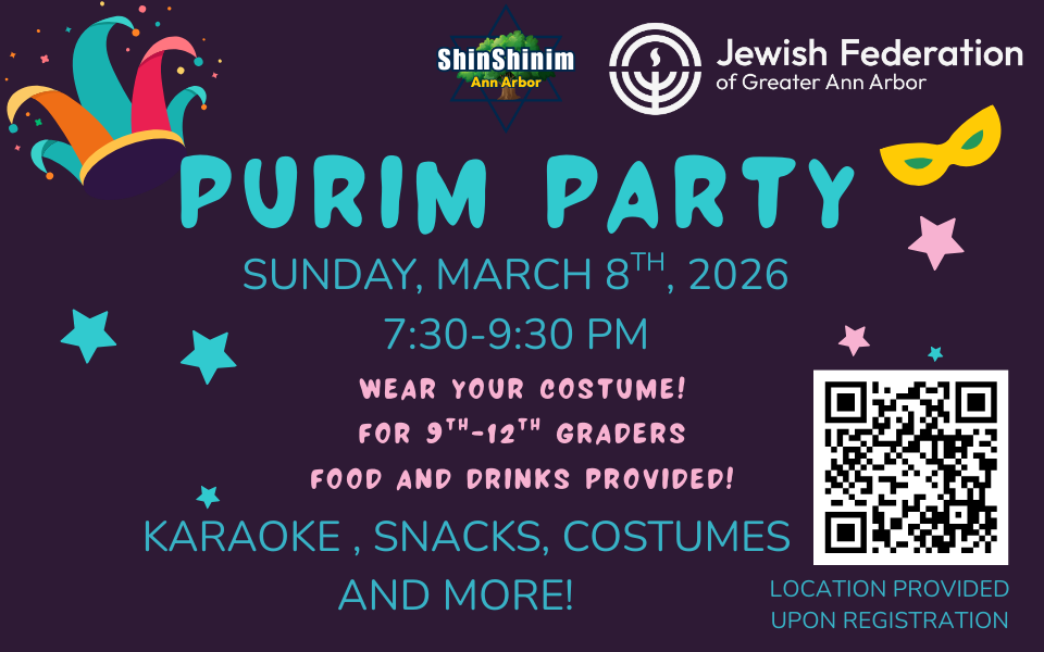 Please join us for a Purim Party for Israeli families hosted by the Shinshinim. There will be a small selection of snacks and drinks. We will have activities for children, music, and good energy. Costumes encouraged, but are not required. Organized by: Jewish Federation of Greater Ann Arbor View event on Jlive: https://jlive.app/events/14525