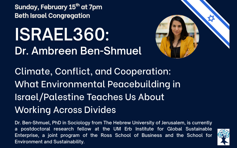 Dr. Ben-Shmuel, PhD in Sociology from The Hebrew University of Jerusalem, is currently a postdoctoral research fellow at the UM Erb Institute for Global Sustainable Enterprise, a joint program of the Ross School of Business and the School for Environment and Sustainability. Organized by: Beth Israel Congregation View event on Jlive: https://jlive.app/events/14287