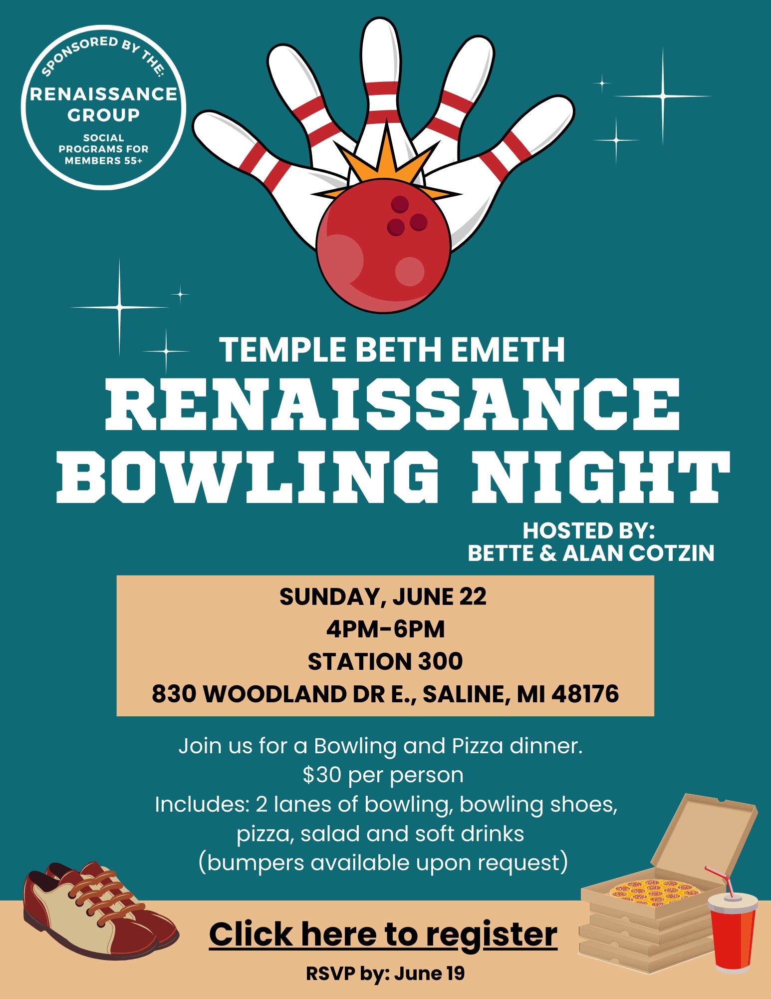 TBE: Renaissance Group Bowling Night June 22, 2025 @ 4:00 pm - 6:30 pm EDT Station 300 830 Woodland Dr E, Saline, Michigan