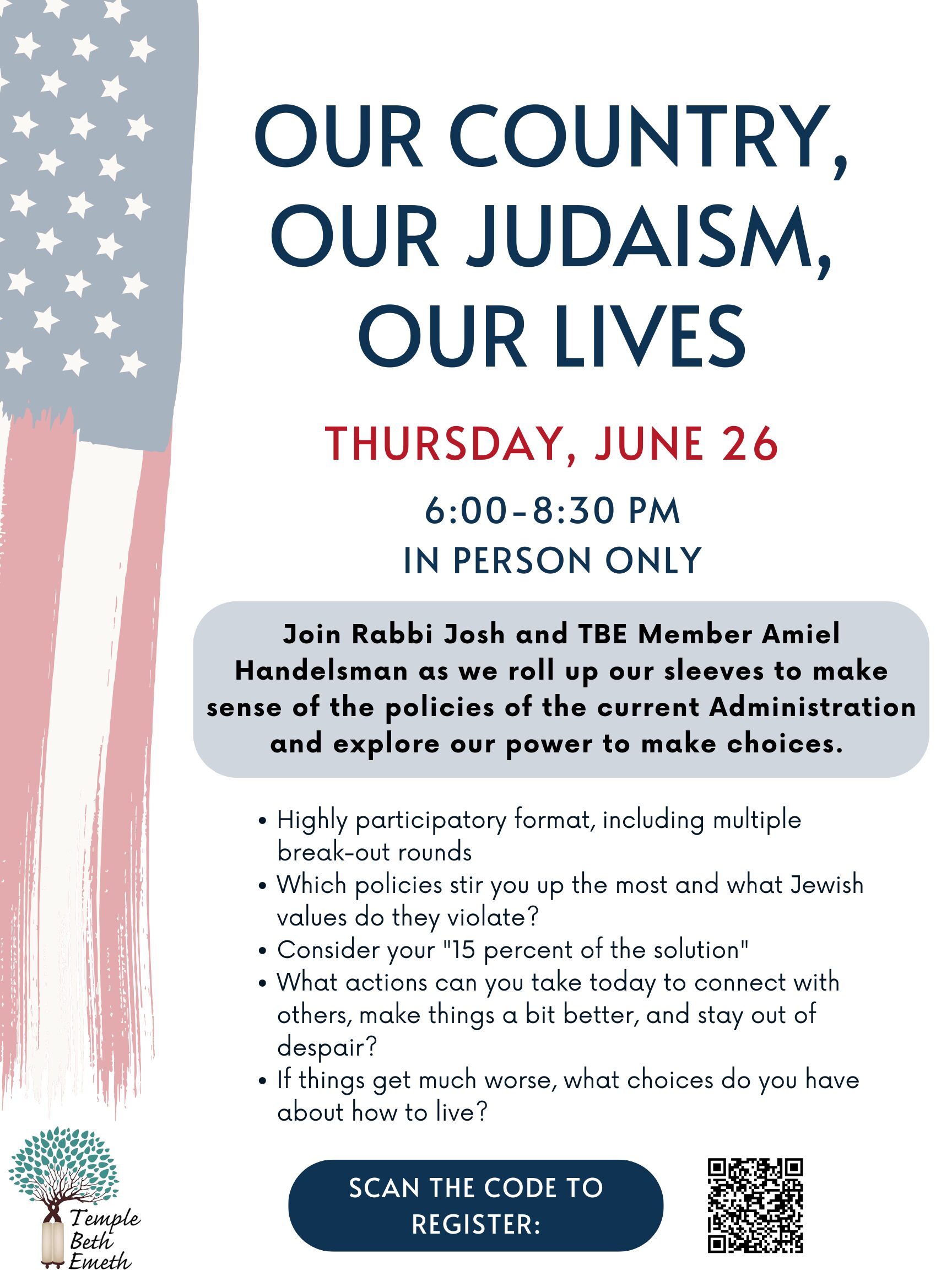 Our Country, Our Judaism, Our Lives June 26, 2025 @ 6:00 pm - 8:30 pm EDT Temple Beth Emeth 2309 Packard St, Ann Arbor, MI, United States