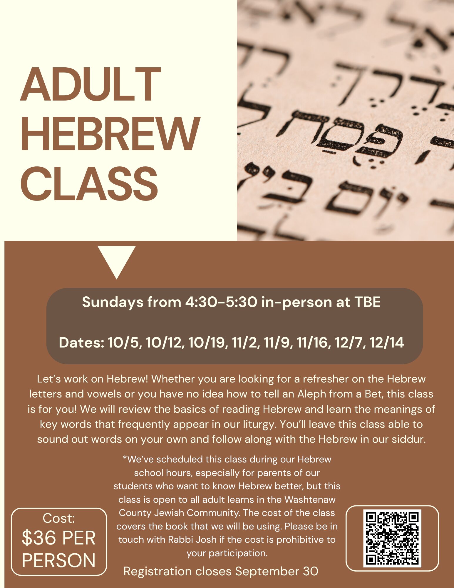 Temple Beth Emeth 2309 Packard St, Ann Arbor, MI, United StatesLet’s work on Hebrew! Whether you are looking for a refresher on the Hebrew letters and vowels or you have no idea how to tell an Aleph from a Bet, […]
