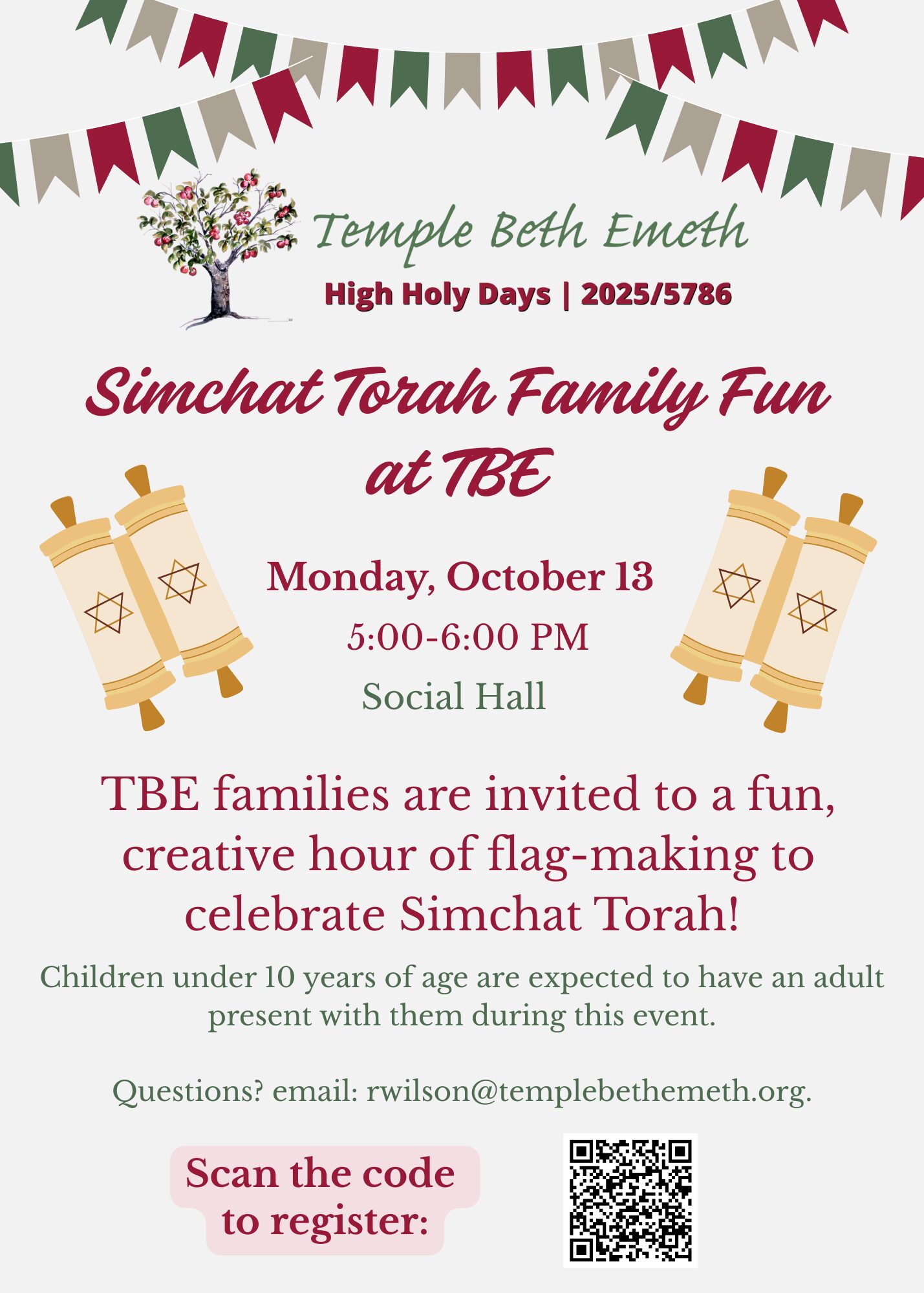 Temple Beth Emeth 2309 Packard St, Ann Arbor, MI, United StatesTBE families are invited to a fun, creative hour of flag-making to celebrate Simchat Torah! Children under 10 years of age are expected to have an adult present with them […]