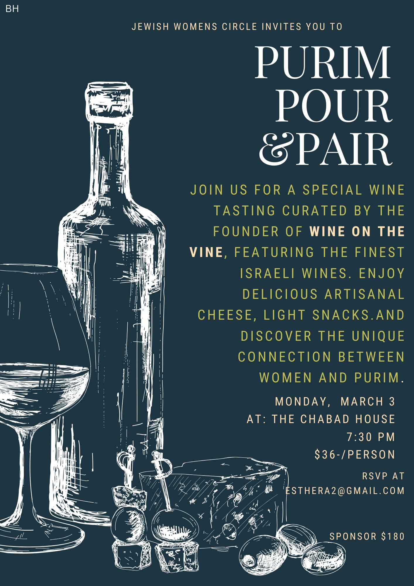 The Jewish Women’s Circle invites you to a special Purim wine tasting! Join us for an evening of fine wine, delicious pairings, and Purim inspiration! Experience a unique wine tasting led by the founder of Wine On The Vine, featuring the finest Israeli wines. As we sip and savor, we’ll explore the special connection between […] |