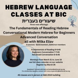 6-6:45 The Fundamentals of Reading Hebrew: Learn the basic principles of reading in Hebrew, practice fluency and develop confidence when reading Hebrew. (Texts in class will include prayers, biblical verses and modern passages.)