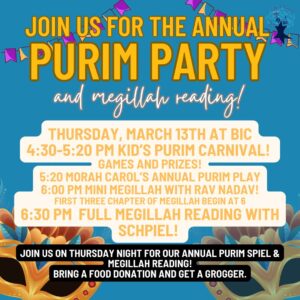 Bring the kids at 4:30 for games, snacks, and fun! Morah Carol’s Annual Purim Play will start at 5:20. The mini megillah for the littles will begin at 6 at the same time as the first three chapters of the traditional megillah. Traditional megillah reading with schpiel will start at 6:30.
