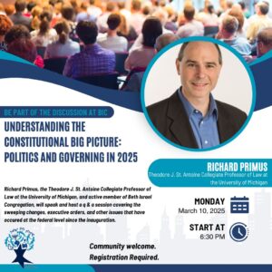 Richard Primus, the Theodore J. St. Antoine Collegiate Professor of Law at the University of Michigan, and active member of Beth Israel Congregation, will speak and host a q & a session covering the sweeping changes, executive orders, and other issues that have occurred at the federal level since the inauguration. Please submit questions about these topics beforehand. This event will be broadcast on our YouTube channel.