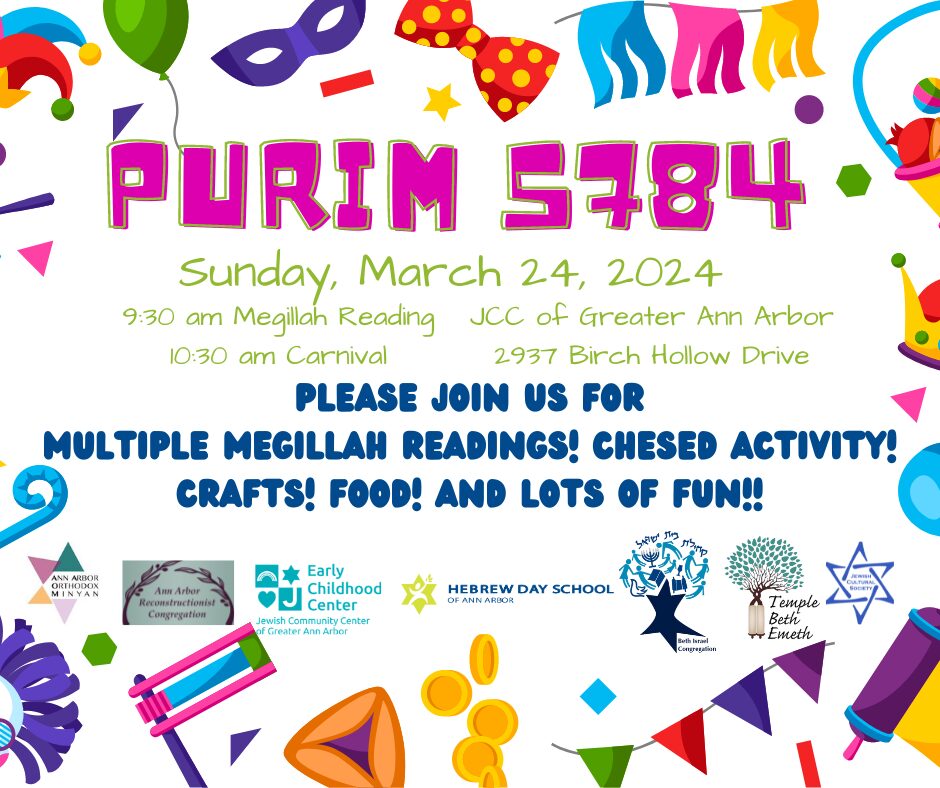 This event is in partnership with the Hebrew Day School of Ann Arbor, Ann Arbor Orthodox Minyan, Beth Israel Congregation, Temple Beth Emeth, Ann Arbor Reconstructionist Congregation, Jewish Cultural Society, and the JCC of Greater Ann Arbor Early Childhood Center.