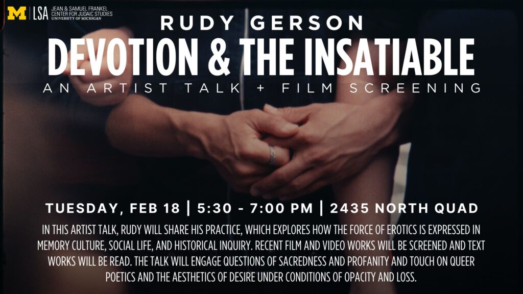Rudy Gerson is an artist and educator working across mediums of print, still and moving image, and performance. In this artist talk, Rudy will share his practice, which explores how the force of erotics is expressed in memory culture, social life, and historical inquiry. Recent film and video works will be screened and text works will be read. The talk will engage questions of sacredness and profanity and touch on queer poetics and the aesthetics of desire under conditions of opacity and loss.