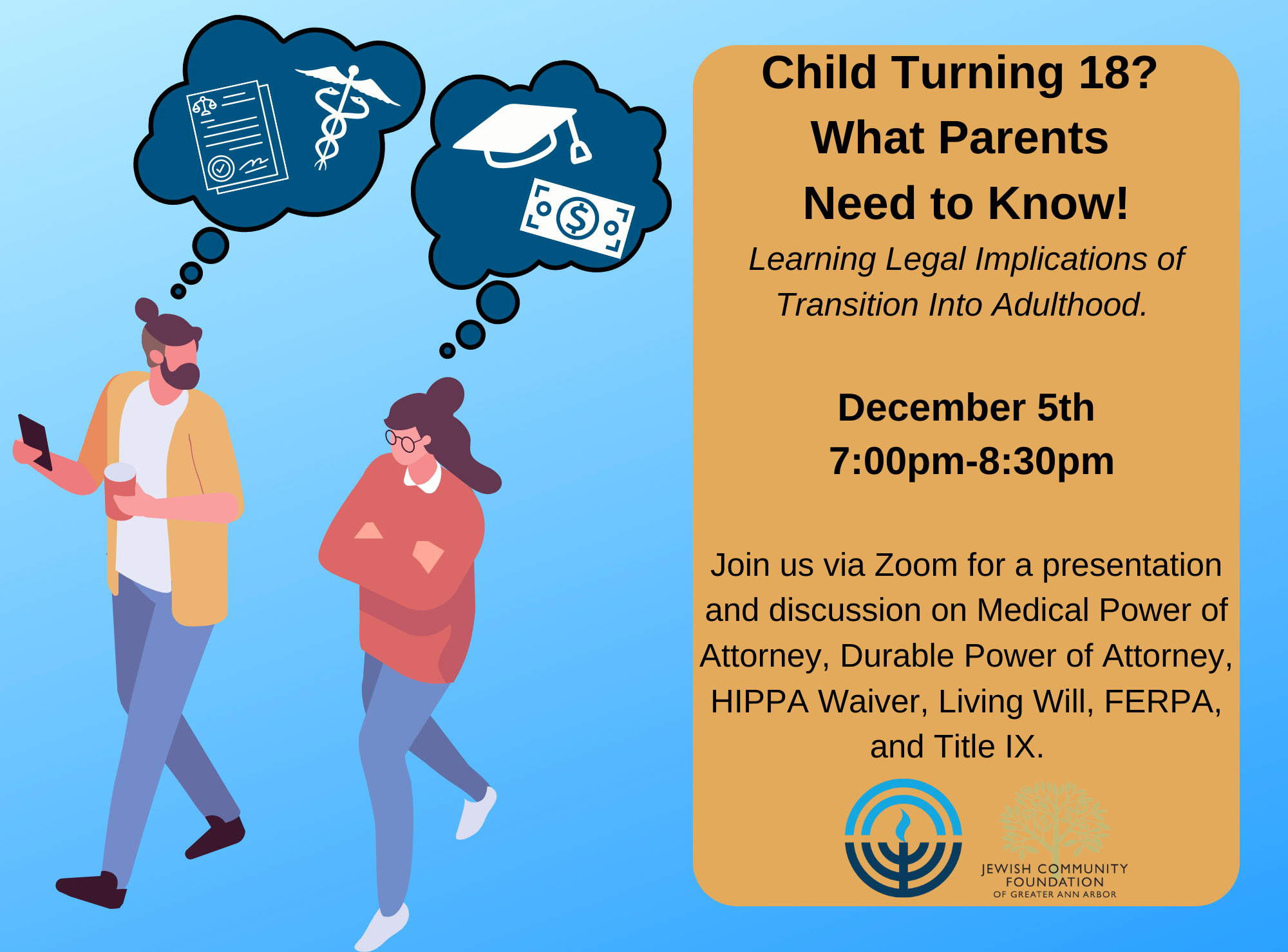 Join us for this virtual program from the Jewish Community Foundation of Greater Ann Arbor. This program is for parents who want to know legal issues surrounding a child turning 18. How does FERPA work? What does medical power of attorney do? These and many other issues will be discussed.
