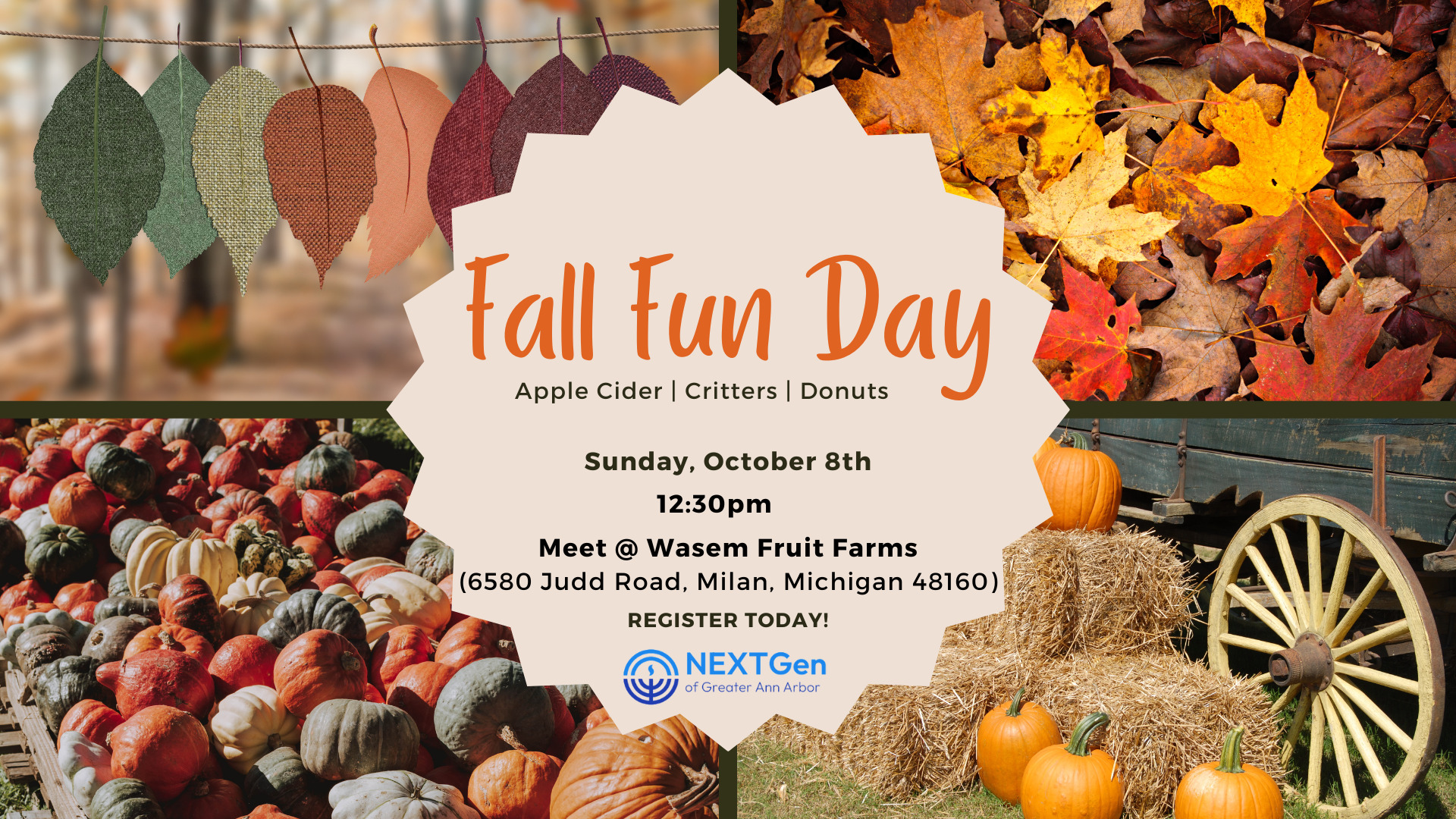 Join NEXTGen A2 for our annual Fall Fun Day! We’ll start the day with apples and cider at Wasem Fruit Farm 🍎, then head over to the Creature Conservancy to learn about friendly local critters 🦉. After official event functions over, feel free to grab a drink at Salt Springs Brewery in nearby Saline 🍺