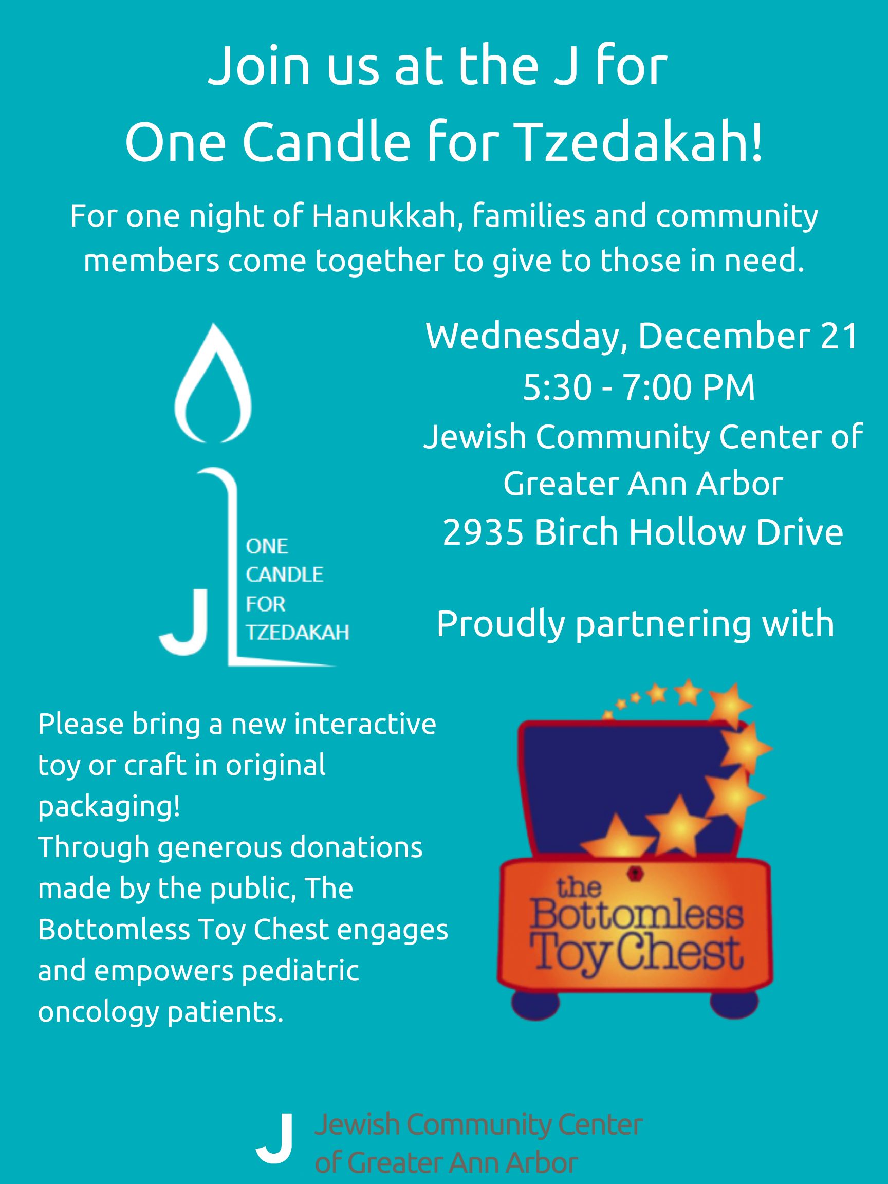 One Candle begins at 5:30 PM with a pizza dinner, edible dreidel making (marshmallows, pretzels, frosting, Hershey kisses), gift wrapping, and fun crafts!