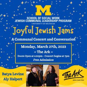 The Jewish Communal Leadership Program is excited to celebrate Jewish joy through music for our annual Communal Conversation event. This March, we are looking forward to bringing together Jewish musical artists who weave Jewish tradition into their music, in celebration of Jewish ritual, culture and peoplehood. This concert will feature queer Jewish artists Batya Levine and Aly Halpert, a born-and-raised Ann Arbor-ite.