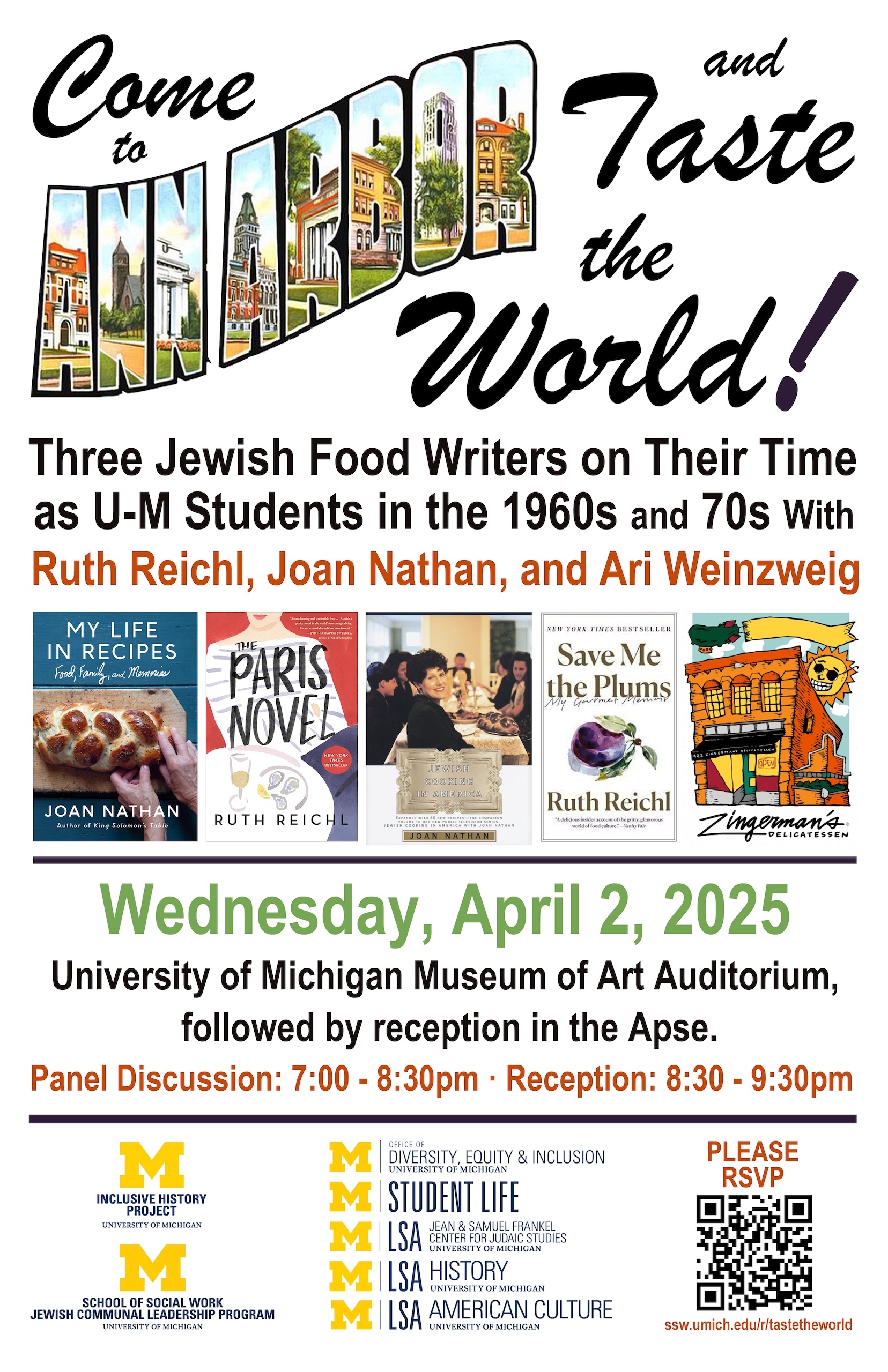 Join the Inclusive History Project and the Jewish Communal Leadership Program for a conversation with world-renowned food writers and U-M alumni Joan Nathan, Ruth Reichl, and Ari Weinzweig. The three will be in conversation on Wednesday, April 2, discussing the rich cultural encounters they experienced as students inAnn Arbor and sharing how their time at U-M shaped their career trajectories. Reichl and Nathan were on campus in the 1960s and Weinzweig in the 1970s, critical and prolific decades when experimentation and innovation were being fostered from multiple vantage points through multiple senses, including taste! The conversation will explore how food and identity are tied together and how those ties have been experienced and explored by our special guests as students and in their careers.