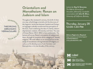 Throughout the nineteenth century, the birth of what one may call philologia orientalis and the discovery of the linguistic similarities between Sanskrit and European languages radically transformed the perception of the East, much weakening the idea of a family relationship between Judaism, Christianity and Islam. The case of Ernest Renan (1823-1892) is here emblematic. The lecture will survey Renan’s conception of Judaism and Islam, through his invention of the category of “Semitic religions.” We shall reflect on its consequences on the study of monotheism among historians of religions, as well as on the development of anti-Semitism and Islamophobia in the last decades of the century.