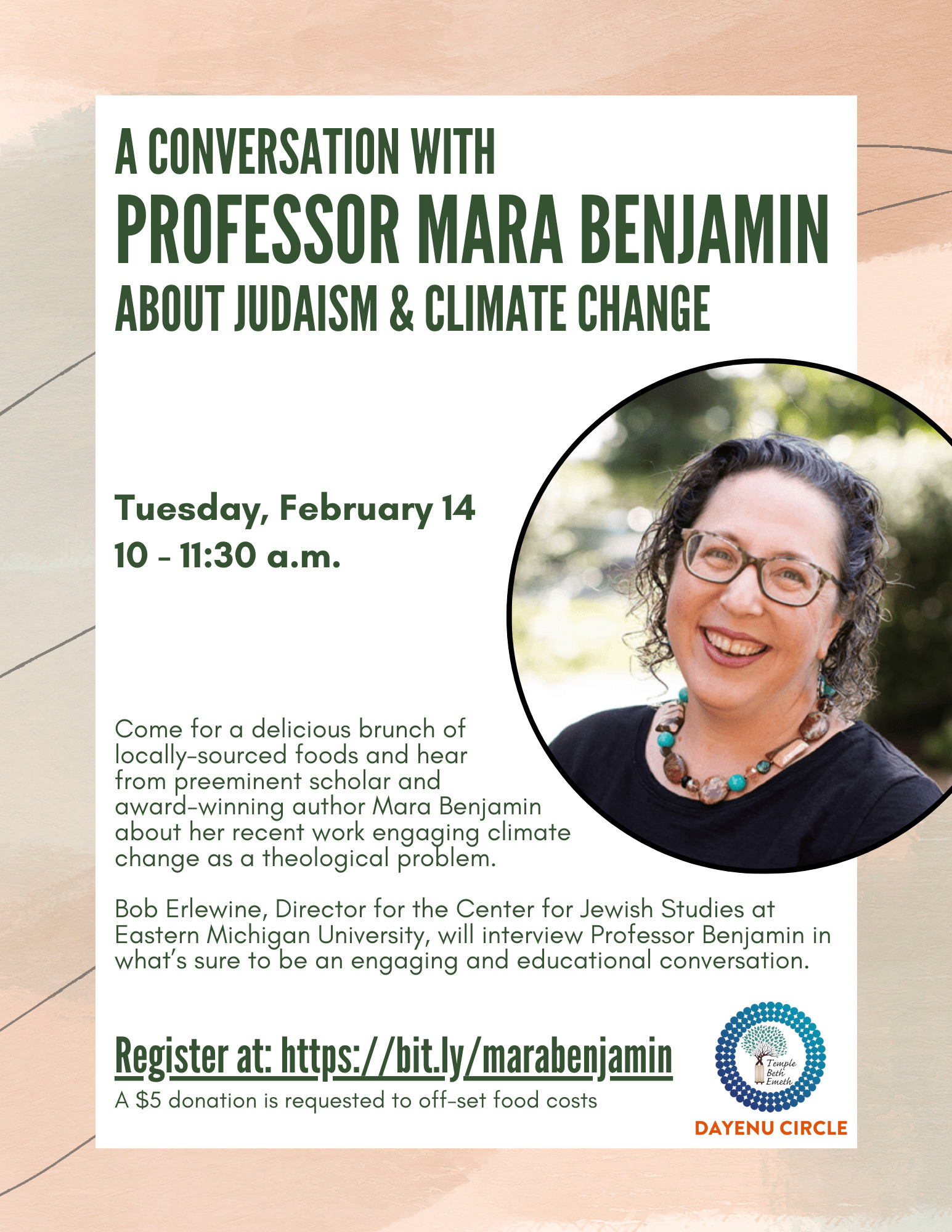 Come for a delicious brunch of locally-sourced foods and hear from preeminent scholar and award-winning author Mara Benjamin about her recent work engaging climate change as a theological problem.