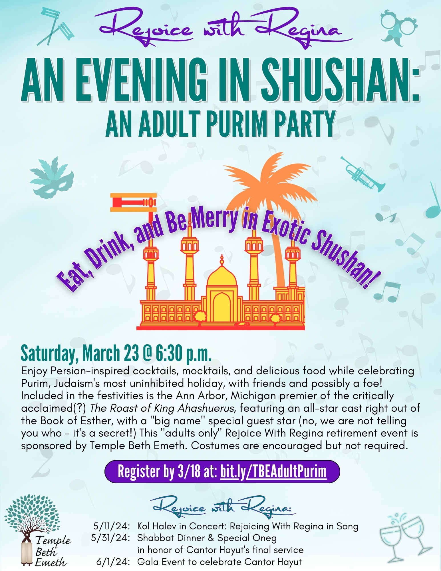 Enjoy Persian-inspired cocktails, mocktails, and delicious food while celebrating Purim, Judaism’s most uninhibited holiday, with friends and possibly a foe! Included in the festivities is the Ann Arbor, Michigan premier of the critically acclaimed(?) The Roast of King Ahashuerus, featuring an all-star cast right out of the Book of Esther, with a “big name” special guest star (no, we are not telling you who – it’s a secret!) This “adults only” Rejoice With Regina retirement event is sponsored by Temple Beth Emeth. Costumes are encouraged but not required.