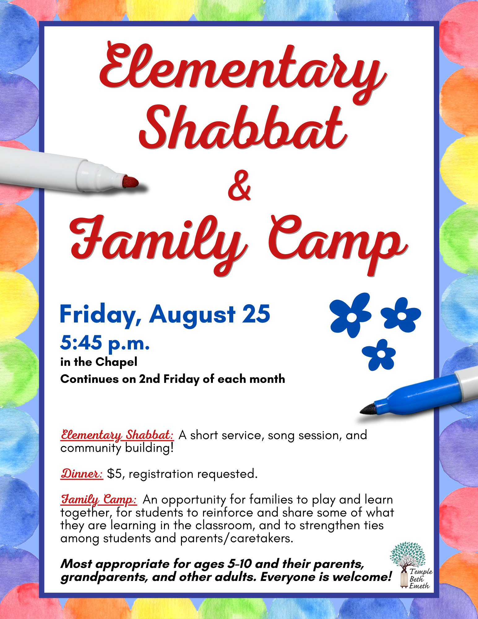 Family Camp: Family Camp is part of our monthly Elementary Shabbats, although younger and older siblings are totally welcome, too! Each time we will have a different theme, largely focused on Jewish holidays, and we will play team-building games and have competitions all based around that theme.