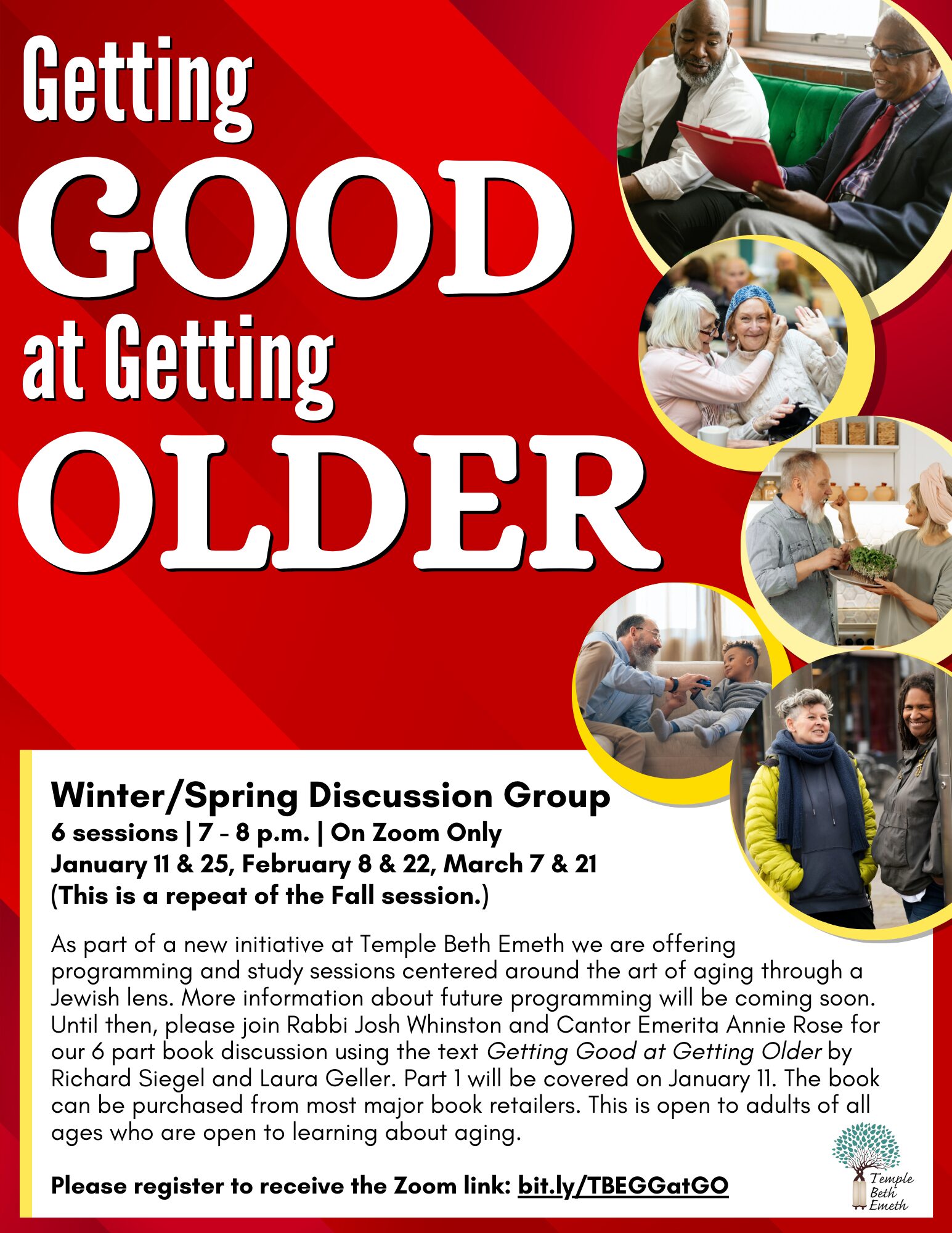 As part of a new initiative at Temple Beth Emeth we are offering programming and study sessions centered around the art of aging through a Jewish lens. More information about future programming will be coming soon. Until then, please join us for our 6 part book discussion using the text Getting Good at Getting Older by Richard Siegel and Laura Geller. The book can be purchased from most major book retailers. This is open to adults of all ages who are open to learning about aging.