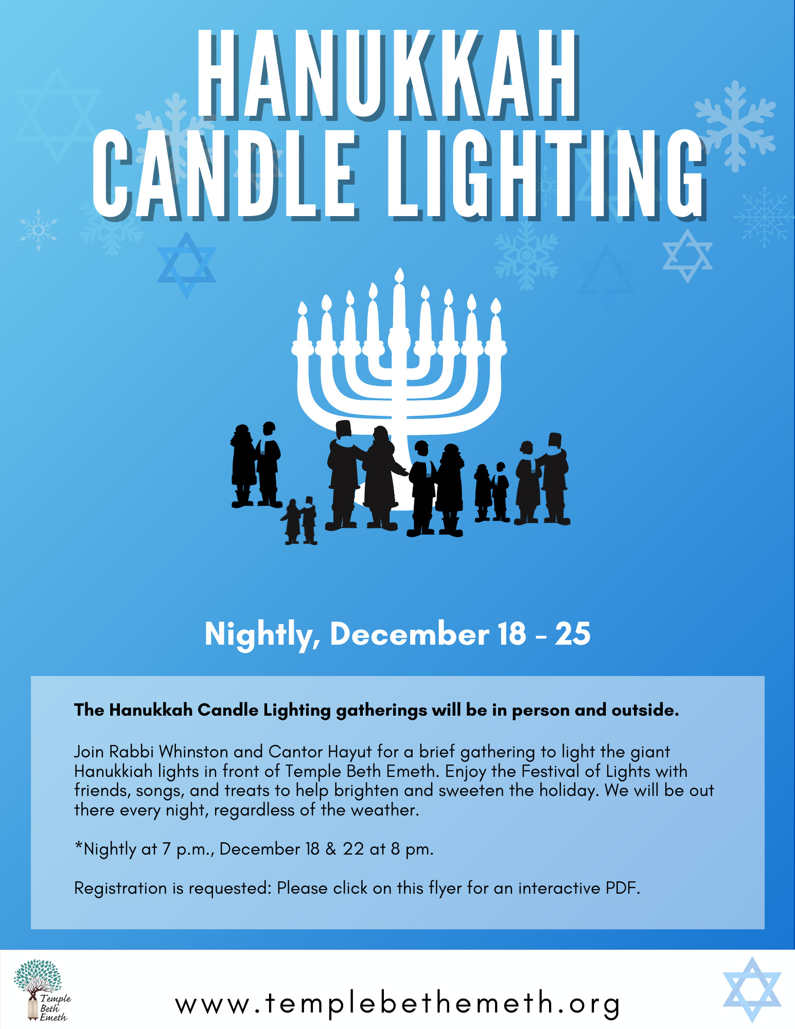 Hanukkah Candle Lighting at Temple Beth Emeth – nightly at 7 p.m., December 18 & 22 at 8 p.m.