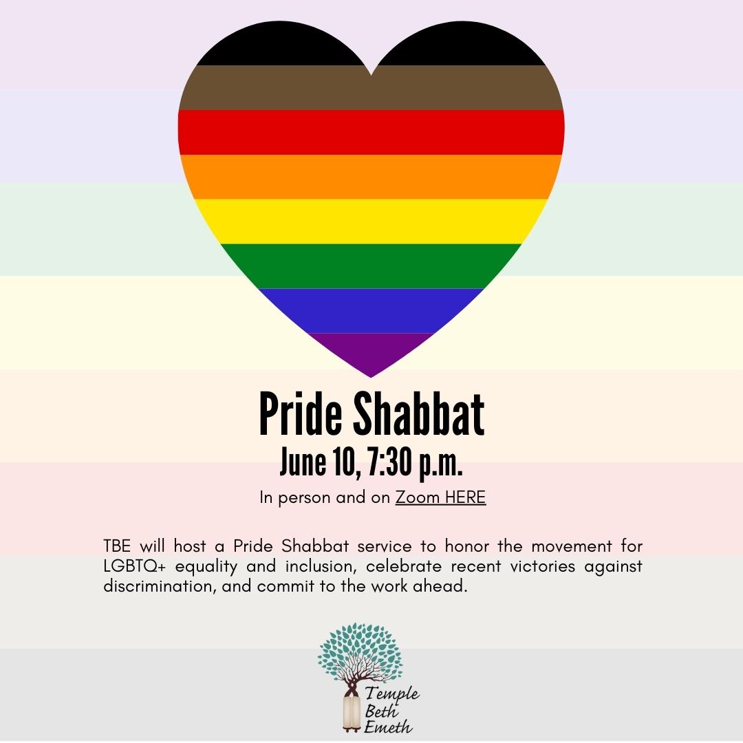 TBE will host a Pride Shabbat service to honor the movement for LGBTQ+ equality and inclusion, celebrate recent victories against discrimination, and commit to the work ahead.