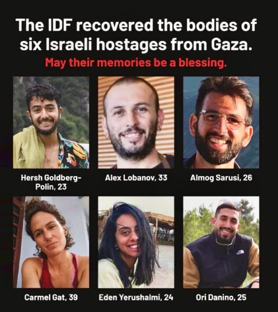 We mourn the loss of these innocent victims of Hamas brutality, Hersh, Eden Yerushalmi z”l, Carmel Gat z”l, Almog Sarusi z”l, Alex Lubnov z”l, and Ori Danino z”l.