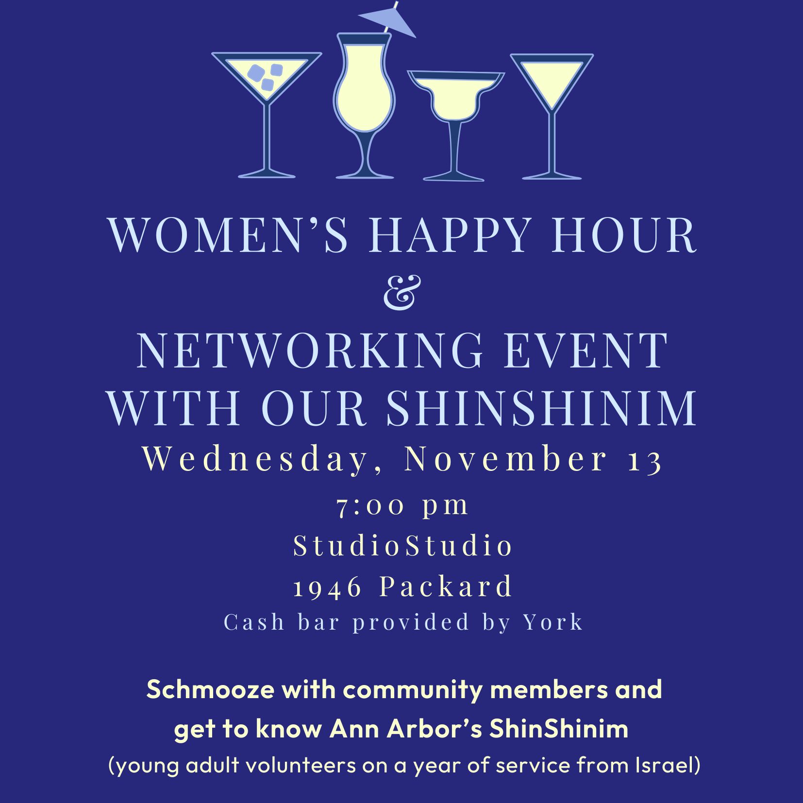 BUILD COMMUNITY! GET INVOLVED! CELEBRATE WITH LIGHT APPS & DRINKS! CONNECT WITH JEWISH WOMEN! MEET OUR COMMUNITY SHINSHINIM! StudioStudio, 1946 Packard St. Wednesday, November 13 at 7:00 pm REGISTER HERE